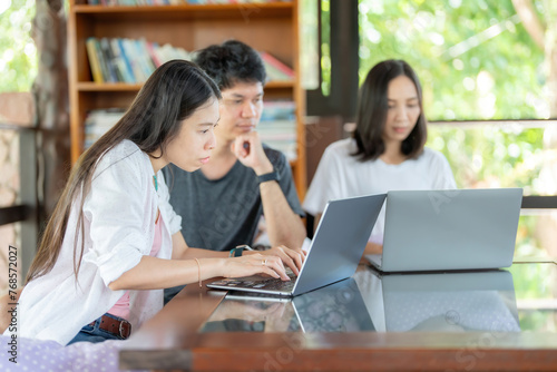 Side view of an Asian female student studying online on a laptop and two friends in the library. They are studying in a university group and read books every week to gain knowledge.