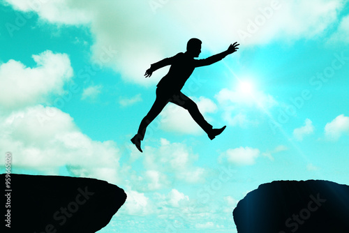 Side view of backlit person jumping from cliff to cliff on bright blue sky with clouds background. Male jumping over abyss. Fear, adventure and fitness concept.