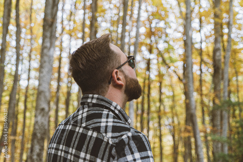 Side view of bearded male traveler in casual plaid shirt and trendy sunglasses standing and exploring autumn trees at forest