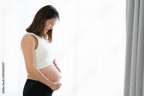 Side view of beautiful pregnant Asian young woman standing, looking and touching her belly with love and care at home near window. Pregnancy lifestyle. Copy space.