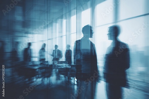 Side view of blurred silhouettes of businessmen talking in conference room, view through the transparent glass wall. High quality