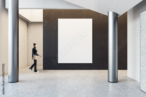 Side view of businessman walking in modern hallway interior with columns, blank white mock up banner and daylight.