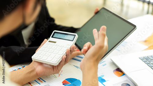 Side view of businesspeople consulting on their project with paperwork and calculator