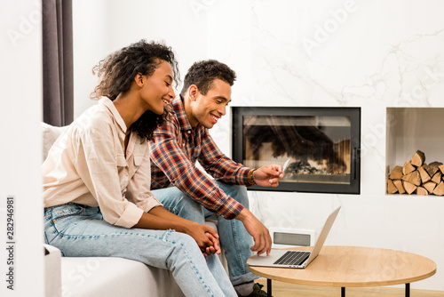 side view of couple sitting on sofa and looking at laptop while man holding credit card