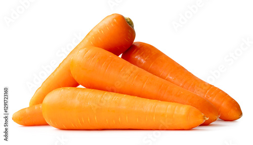 Side view of five fresh orange carrot roots in stack isolated on white background with clipping path