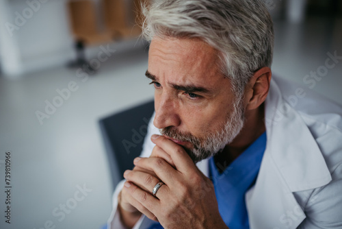 Side view of frustrated, exhausted doctor sitting in hospital corridor. Concept of burnout syndrome among doctors.