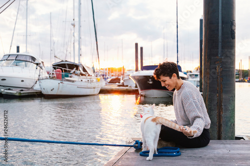 Side view of happy woman with cat sitting on pier at harbor against cloudy sky during sunset