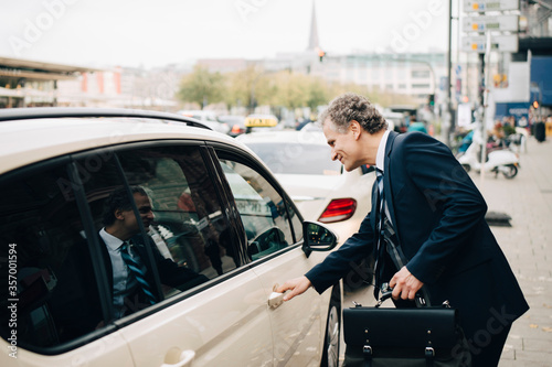 Side view of mature businessman holding taxi door in city
