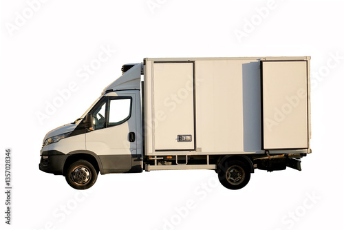Side View Of Refrigerated Insulated Delivery Truck Isolated on White Background, Temperature-Controlled Perishable Goods Transport Vehicle