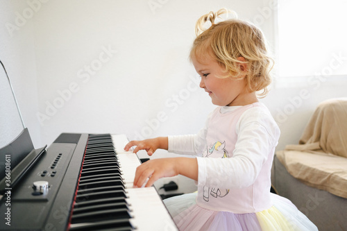 Side view of schoolgirl in fluffy skirt sitting at synthesizer and preparing for music class looking at camera