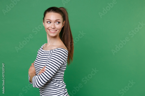Side view of smiling attractive young brunette woman 20s wearing striped casual clothes posing standing holding hands crossed looking aside isolated on green color wall background, studio portrait.
