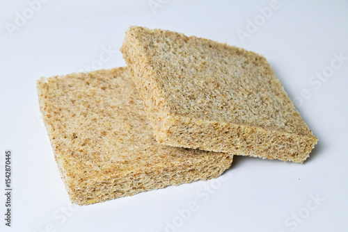 Side view of two whole wheat slices breads with abstract product background. Isolated on white. Clipping path. pile, stack. close up.