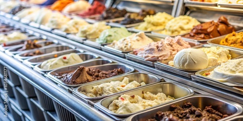 Side view of various tubs of Breyers Ice Cream with prices in a supermarket , groceries, dessert, frozen treat, shopping