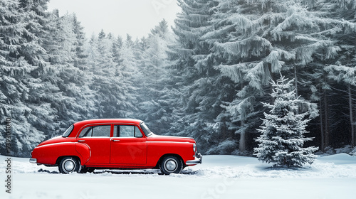 Side View of Vintage Car in Snowy Forest. Red vintage car in snowy forest, evoking a serene winter or holiday scene.