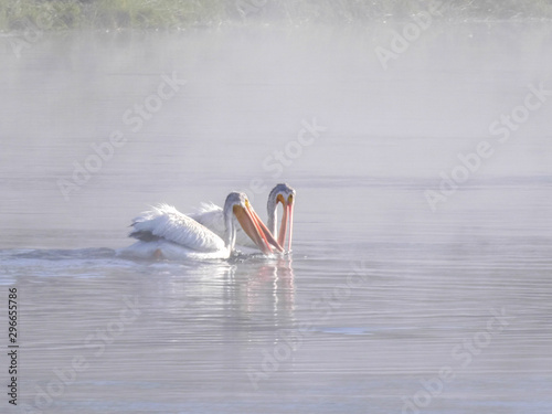 side view of white pelicans feeding on a foggy morning in yellowstone