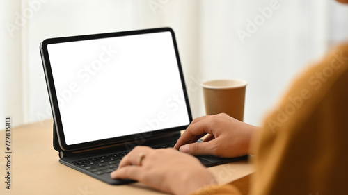 Side view of young creative woman working online on digital tablet in bright living room