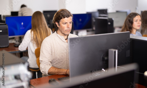 Side view on concentrated male student sitting at library desk with pc, preparing for exam in computer class