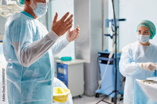 side view on senior caucasian male doctor wearing robe before operation, surgery