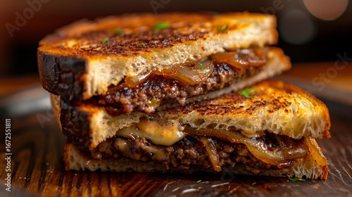 "Side view patty melt stack, caramelized onions, rye bread, chaos 26