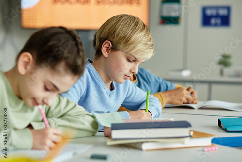 Side view portrait of young blonde boy taking test in school classroom with group of children sitting in row