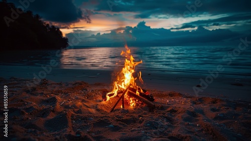 Side view, roaring bonfire on a peaceful beach, summer night, orange and blue color harmony, embers drifting, distant lighthouse beam