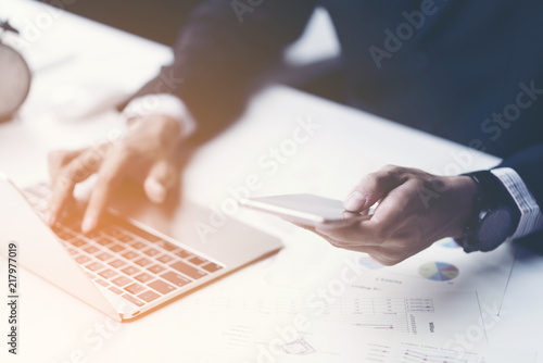 Side view shot of a man's hands using smart phone in interior, rear view of business man hands busy using cell phone, young male student typing on phone sitting at wooden table focus on the hand