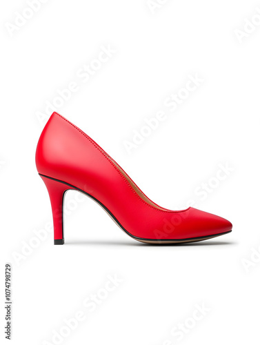Side view sleek red high-heeled stiletto shoe isolated on white background