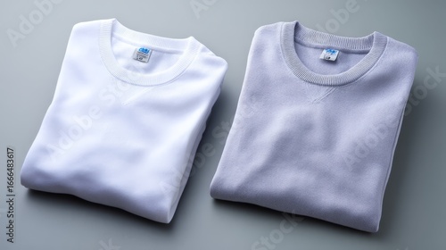 Sideangle view of folded white and light gray cotton crewneck sweaters showcasing front and back panels with crisp textures and subtle shadows in clean minimal background