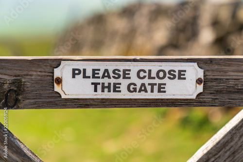 Sign: Please close the gate, seen in the Yorkshire Dales near Pen-y-ghent, North Yorkshire, England, UK