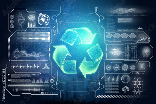 Sign Recycling hologram on a dark background. Eco recycling green symbol. The concept of clean land, garbage disposal. 3D illustration, 3D render.