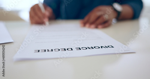 Signature, contract or document for divorce in home with legal paperwork, notary or decision in closeup. Person, hand and sad for breakup, marriage or conflict in relationship for problem by affair