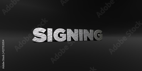 SIGNING - hammered metal finish text on black studio - 3D rendered royalty free stock photo. This image can be used for an online website banner ad or a print postcard.
