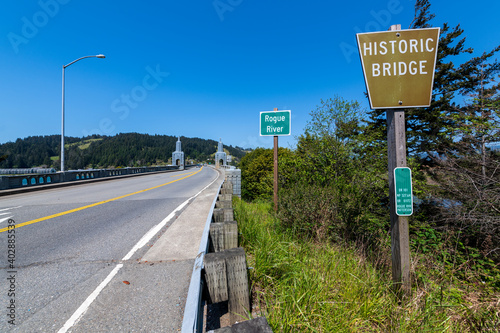 Signs and obelisks on the south end of the Rogue River Bridge at Gold Beach, Oregon, USA