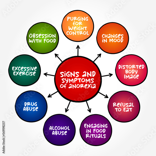 Signs and symptoms of Anorexia (eating disorder and serious mental health condition) mind map concept background