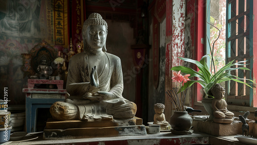 Silent Serenity: An Old Buddha Statue in a Shabby Temple