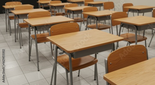 Silent Study Hall: Orderly Rows of Empty Wooden Desks in a Classroom