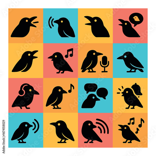 Silhouette bird icon set featuring communication, music, singing, and social interaction symbols