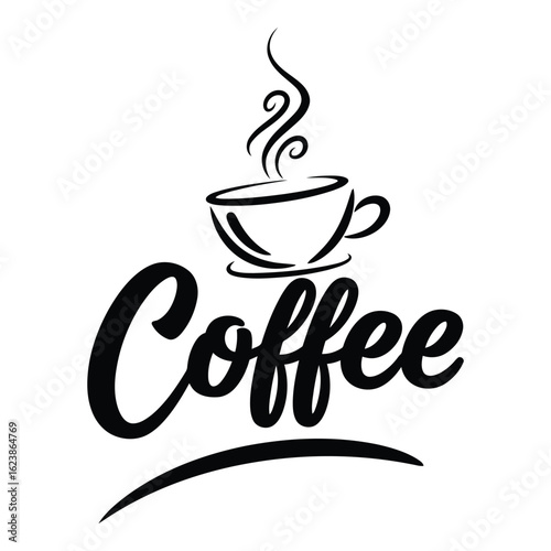 Silhouette black vector coffee cup with steam and calligraphy isolated on white background