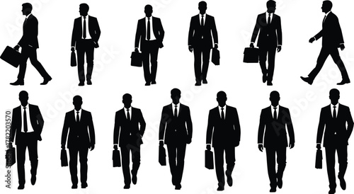 Silhouette business men with briefcases, walking and standing poses, black outline figures, minimal vector design, professional gesture concept, corporate movement illustration