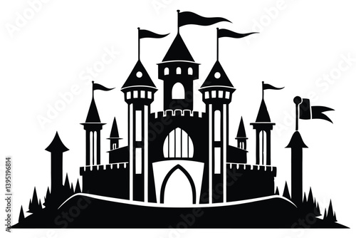 Silhouette Castle with Towers and Flags Medieval Fortress, Fantasy, Black and White