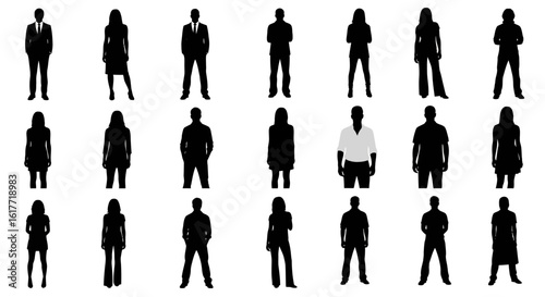 Silhouette collection of diverse people standing on white background in various poses and outfits