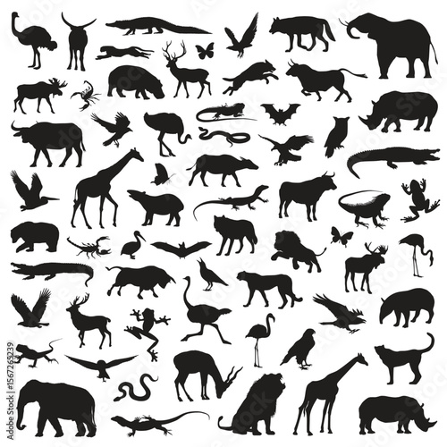 Silhouette compilation of diverse animals including mammals reptiles amphibians birds and insects