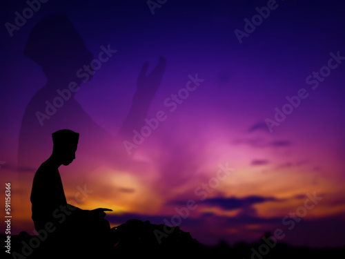 silhouette concept of muslim man praying to allah on hill. with a beautiful natural sunset panorama. focus on people