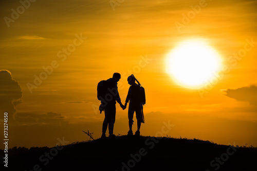 Silhouette couple on the mound in the sunset sky