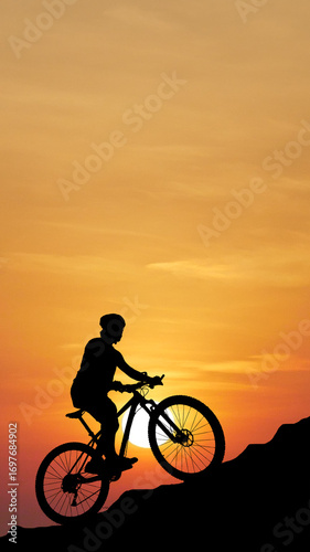 Silhouette cyclist conquer sunrise: A silhouetted cyclist conquers a steep incline against the fiery canvas of the setting sun.