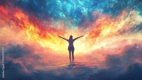 Silhouette embraces fiery, celestial cloudscape.