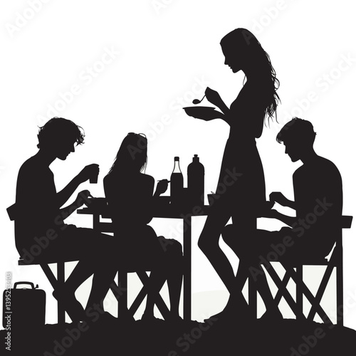 Silhouette Family Dining Table Gathering in Black and White Illustration