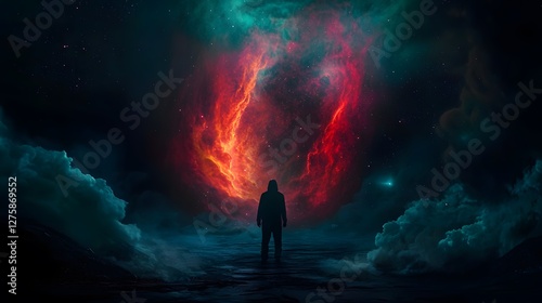 Silhouette Figure Contemplates a Cosmic Portal in Surreal Landscape
