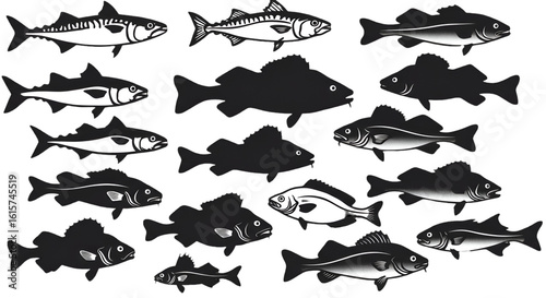 Silhouette Fish Illustrations in Black and White on Transparent Background
