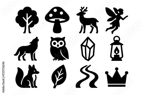 Silhouette forest symbols: wildlife, nature elements, and mystical icons
